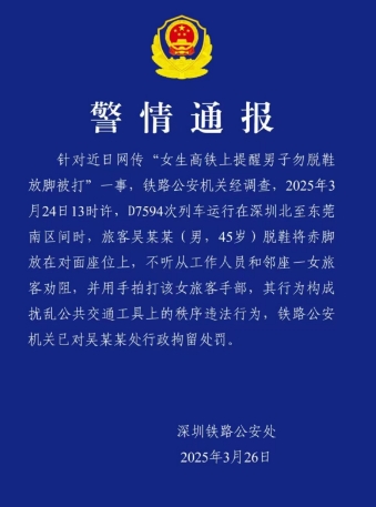 3月26日,@深圳鐵路公安處 發(fā)布警情通報稱,針對近日網(wǎng)傳“女生高鐵上提醒男子勿脫鞋放腳被打”一事,鐵路公安機關(guān)經(jīng)調(diào)查,2025年3月24日13時許,D7594次列車運行在深圳北至東莞南區(qū)間時,旅客吳某某(男,45歲)脫鞋將赤腳放在對面座位上,不聽從工作人員和鄰座一女旅客勸阻,并用手拍打該女旅客手部,其行為構(gòu)成擾亂公共交通工具上的秩序違法行為,鐵路公安機關(guān)已對吳某某處行政拘留處罰。