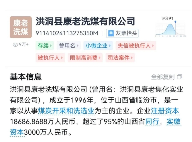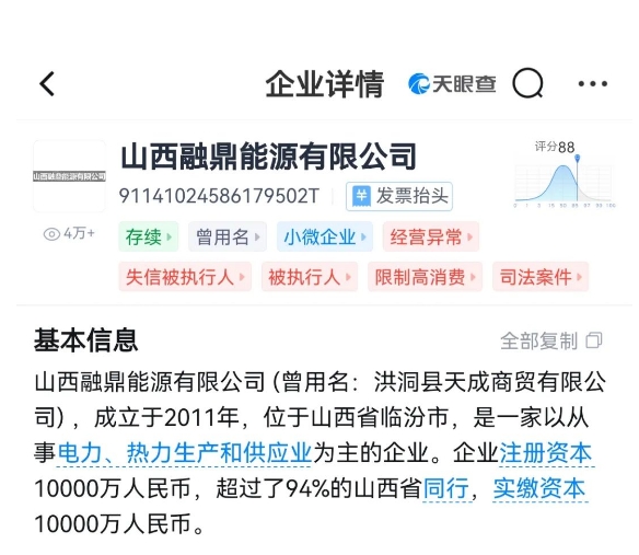經(jīng)天眼查顯示,山西融鼎能源有限公司及洪洞縣康老洗煤有限公司目前均出現(xiàn)經(jīng)營異常,涉及司法訴訟案件,并且相關(guān)企業(yè)負(fù)責(zé)人等已經(jīng)被列為失信執(zhí)行人員,同時已被限高。