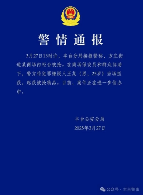 北京豐臺(tái)警方通報(bào),3月27日13時(shí)許,豐臺(tái)分局接報(bào)警稱(chēng),方莊街道某商場(chǎng)內(nèi)柜臺(tái)被搶。在商場(chǎng)保安員和群眾協(xié)助下,警方將犯罪嫌疑人王某(男,25歲)當(dāng)場(chǎng)抓獲,起獲被搶物品。目前,案件正在進(jìn)一步偵辦中。