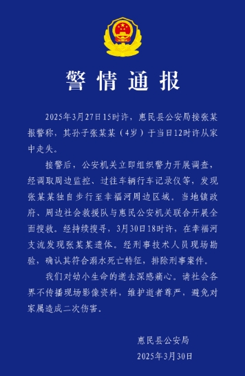 山東濱州惠民縣警方30日通報(bào),3月27日15時(shí)許,惠民縣公安局接張某報(bào)警稱,其孫子張某某(4歲)于當(dāng)日12時(shí)許從家中走失。
