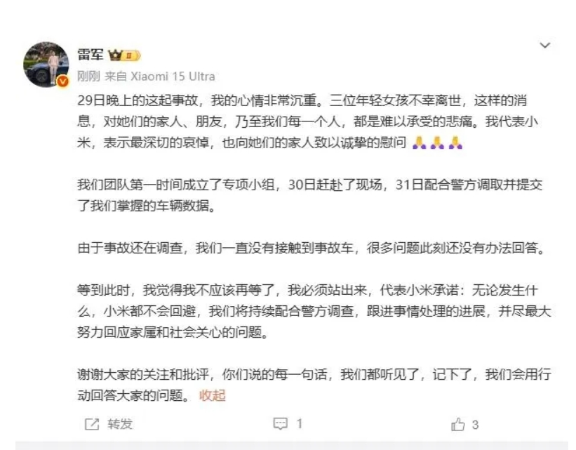 4月1日晚間 ,@雷軍 發(fā)文回應(yīng)小米su7高速碰撞事故: