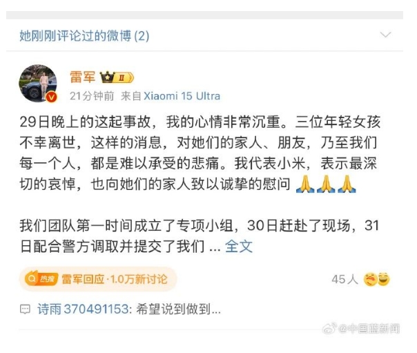 4月1日晚,雷軍回應(yīng)后,SU7事故遇難者母親@詩語370491153 留言評(píng)論:希望說到做到。