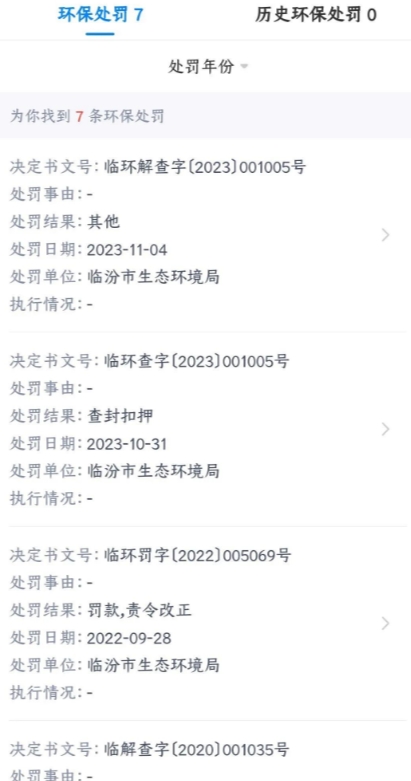 查詢(xún)發(fā)現(xiàn)德鑫建材此前已多次被臨汾市生態(tài)環(huán)境局處罰。然而,從目前的情況來(lái)看,該企業(yè)似乎并未對(duì)這些處罰引起足夠重視,依然我行我素,繼續(xù)違規(guī)生產(chǎn),導(dǎo)致粉塵污染問(wèn)題長(zhǎng)期得不到解決。