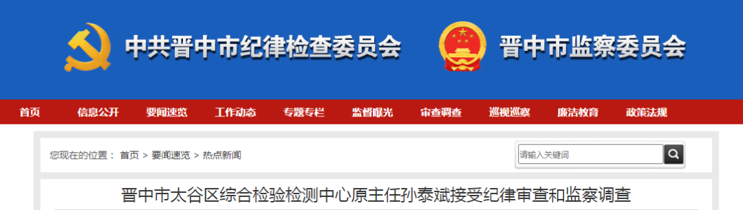 晉中市太谷區(qū)綜合檢驗(yàn)檢測中心原主任孫泰斌涉嫌嚴(yán)重違紀(jì)違法,目前正接受晉中市太谷區(qū)紀(jì)委監(jiān)委紀(jì)律審查和監(jiān)察調(diào)查。