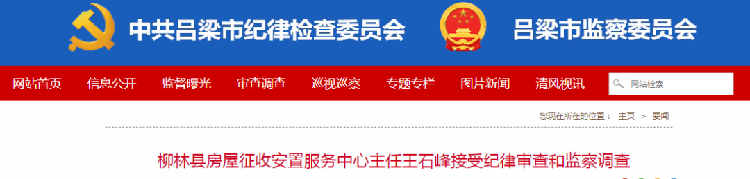 柳林縣房屋征收安置服務(wù)中心主任王石峰涉嫌嚴(yán)重違紀(jì)違法,目前正在接受柳林縣紀(jì)委監(jiān)委紀(jì)律審查和監(jiān)察調(diào)查。