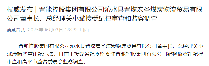 晉能控股集團(tuán)有限公司沁水縣晉煤宏圣煤炭物流貿(mào)易有限公司董事長、總經(jīng)理關(guān)小斌涉嫌嚴(yán)重違紀(jì)違法,目前正接受省紀(jì)委監(jiān)委駐晉能控股集團(tuán)有限公司紀(jì)檢監(jiān)察組紀(jì)律審查和高平市監(jiān)察委員會(huì)監(jiān)察調(diào)查。
