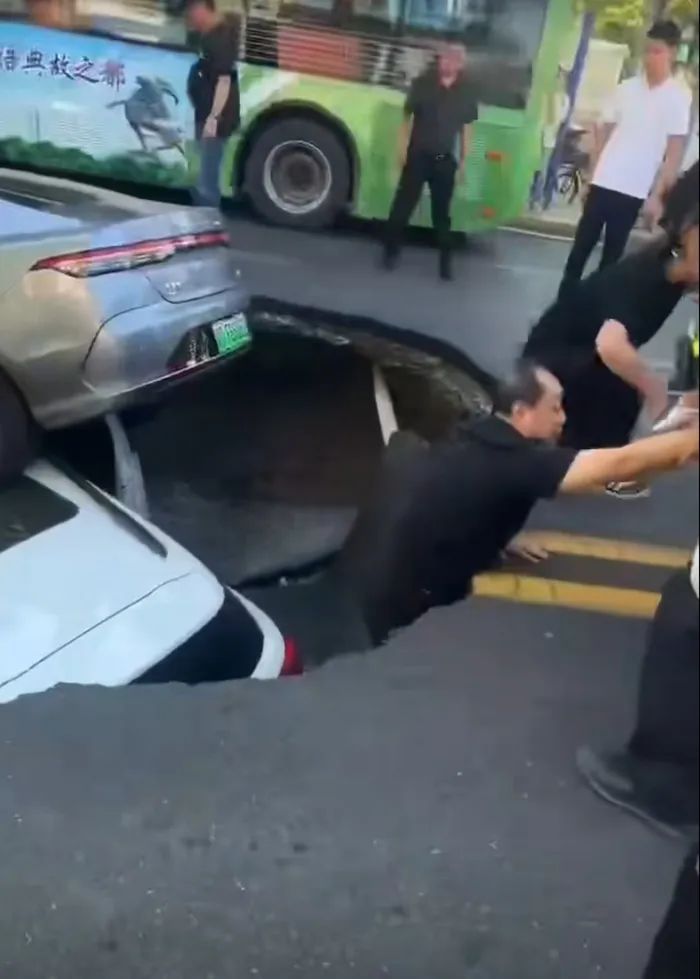 視頻顯示,塌陷坑中墜入了兩輛小型轎車,其中一輛灰色小轎車騎跨在一輛白色SUV上面,可以看到灰色小轎車安全氣囊已彈出,有車上人員從坑中爬出。