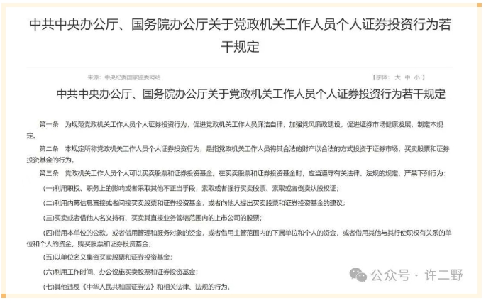 正因如此,從2001年的原始規(guī)定,到近年來(lái)紀(jì)律處分條例、監(jiān)察法的迭代再三,公務(wù)員買(mǎi)股票這件事,逐步被納入監(jiān)督鏈條。