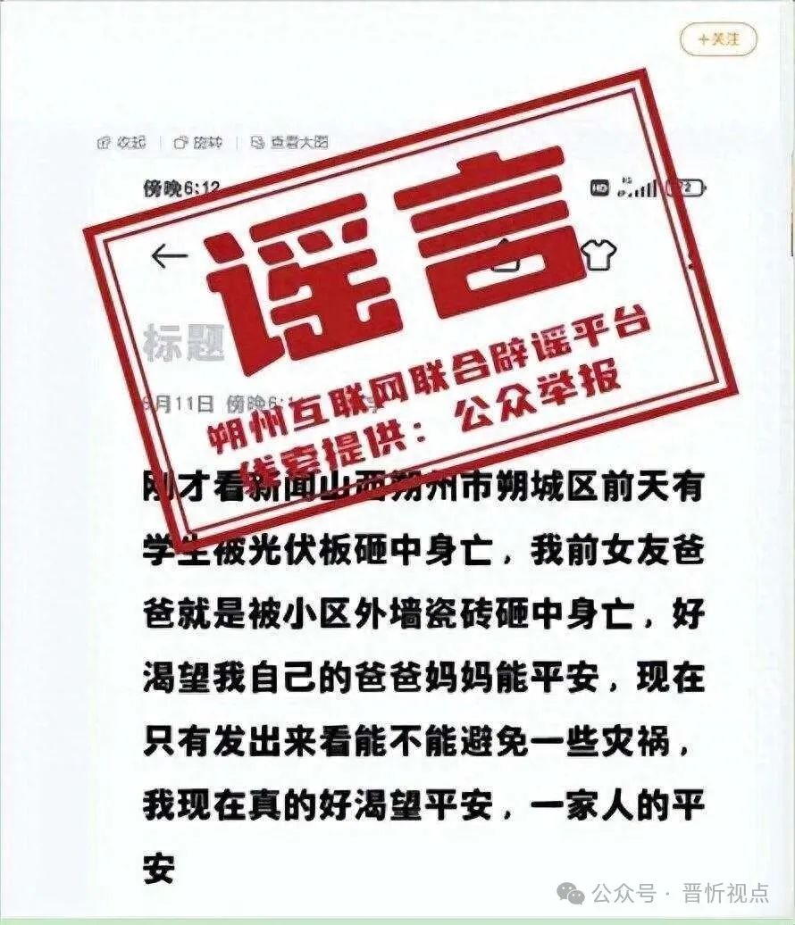 近日,網(wǎng)上出現(xiàn)“山西省朔州市朔城區(qū)有學生被光伏板砸中身亡”的消息,經當?shù)赜嘘P部門調查,該消息不實,望廣大網(wǎng)民不聽、不信、不傳。