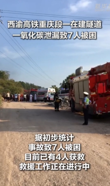 據(jù)新華社報(bào)道,記者從重慶市相關(guān)部門獲悉,17日下午,西渝高鐵重慶段項(xiàng)目在建的中梁山隧道發(fā)生一氧化碳泄漏事故,據(jù)初步統(tǒng)計(jì),事故致7人被困,目前已有4人獲救,救援工作正在進(jìn)行中。
