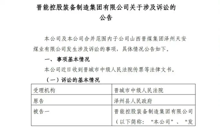近日,晉能控股裝備制造集團(tuán)有限公司公告,因與澤州縣人民政府的股權(quán)轉(zhuǎn)讓糾紛被起訴,涉案金額達(dá)25.186億元。案件源于2012年雙方簽訂的協(xié)議未完全履行,目前尚未開(kāi)庭審理。