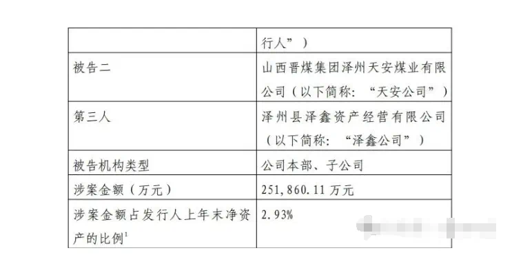 案件的基本情況(1)案由及訴訟標(biāo)的:本案案由為股權(quán)轉(zhuǎn)讓糾紛,訴訟標(biāo)的為2,518,601,148.43 元。 (2)訴訟請(qǐng)求及理由 訴訟請(qǐng)求:原告澤州縣政府訴求被告一繼續(xù)履行雙方于 2012 年 3 月 31 日簽訂《協(xié)議書(shū)》,判決被告二對(duì)上述款項(xiàng)承擔(dān)共同還款責(zé)任,本案訴訟費(fèi)由二被告承擔(dān)。 事實(shí)與理由:山西省按照國(guó)務(wù)院下發(fā)的煤炭資源整合文件政策,確定發(fā)行人為晉城礦區(qū)的整合主體,與澤州縣政府授權(quán)的澤鑫公司于 2009 年 1月設(shè)立天安公司,用于整合澤州縣范圍內(nèi)的中小型煤礦,天安公司設(shè)立時(shí) 發(fā)行人持股 51%、澤鑫公司持股 49%。2012 年 3 月 31 日,發(fā)行人擬向天安 公司增資,經(jīng)協(xié)商后澤州縣政府與發(fā)行人及澤鑫公司簽訂《協(xié)議書(shū)》。協(xié)議約定:“從 2012 年 1 月 1 日起,以天安公司所整合礦井的產(chǎn)能按噸核定資 金,由天安公司負(fù)責(zé)支付給澤州縣財(cái)政局,用于保障縣鄉(xiāng)兩級(jí)政府既得利益的支出,發(fā)行人負(fù)責(zé)監(jiān)督保障。同時(shí)澤州縣政府放棄天安公司的分紅權(quán)利,天安公司稅后可分配利潤(rùn)全部由發(fā)行人享有?!鼻笆鰠f(xié)議履行期間,因政策等原因,天安公司未持續(xù)按協(xié)議約定向澤州縣財(cái)政局支付款項(xiàng)。▌來(lái)源:與煤同行、世界晉商網(wǎng)、山西資本圈等綜合