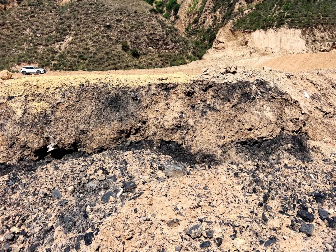 記者5月14日在現(xiàn)場發(fā)現(xiàn),盡管進(jìn)行了黃土覆蓋,但煤矸石場靠近山坡邊緣地帶挖了一條長長的深溝,溝里仍有大片裸露的煤矸石。