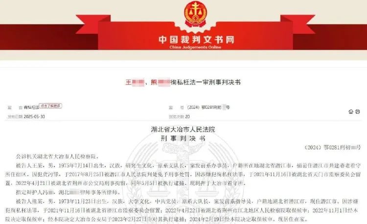 記者通過裁判文書網(wǎng)了解到,2024年8月,湖北省大冶市人民法院作出一審判決,王某、熊某因犯徇私枉法罪,分別被判處有期徒刑三年、有期徒刑一年五個月,二人違法所得被予以追繳,上繳國庫;肖某被另案處理。