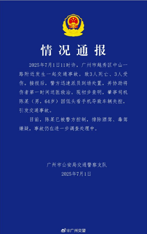 目前,陳某已被警方控制,排除酒駕、毒駕嫌疑,事故仍在進(jìn)一步調(diào)查處理中。