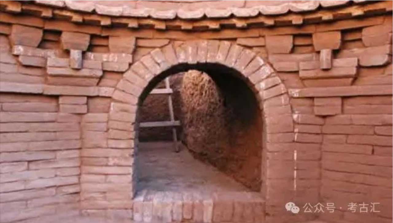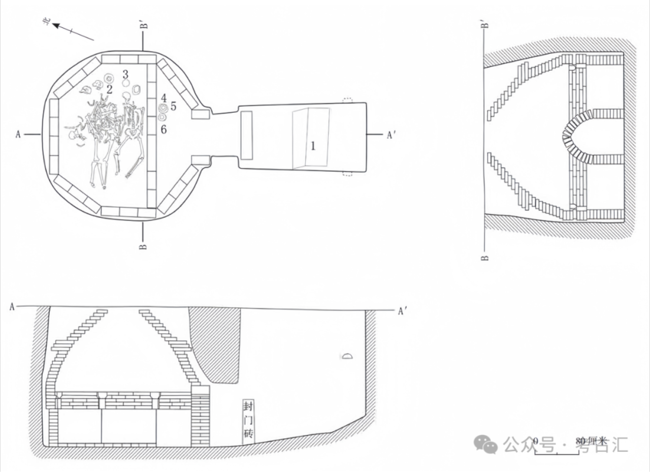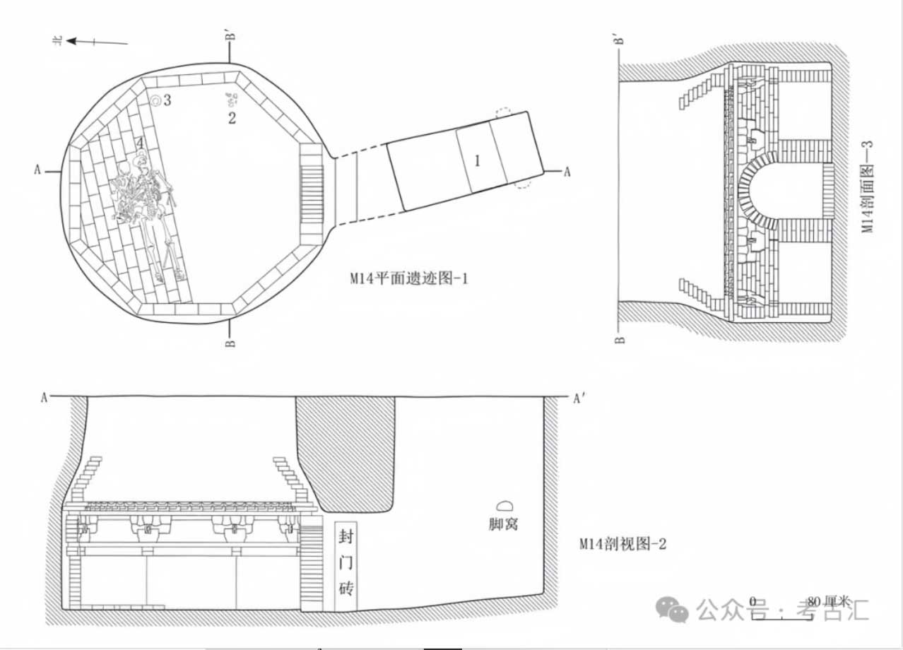 墓葬總體坐北朝南,為八邊形仿木結(jié)構(gòu),有簡(jiǎn)易磚雕構(gòu)件。墓道平面梯形,底部略為斜坡,墓道壁設(shè)腳窩。墓道和墓室之間設(shè)土甬道。封門(mén)磚砌筑于甬道口或甬道內(nèi),壘砌較為隨意。墓門(mén)單券拱形。墓室壁面寬窄不一。壁面飾簡(jiǎn)易仿木結(jié)構(gòu)磚雕,轉(zhuǎn)角不設(shè)柱,之上為磚砌斗栱等裝飾,再上疊澀砌為穹隆頂。墓底不鋪磚。