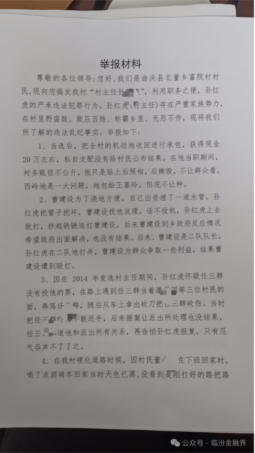 尊敬的各位領(lǐng)導(dǎo):您好,我們是曲沃縣北董鄉(xiāng)窯院村村民,現(xiàn)向您揭發(fā)我村“村主任孫紅虎”,利用職務(wù)之便,孫紅虎的嚴承違法犯罪行為。孫紅虎(村主任)存在嚴重家族勢力,在村里野蠻跋、欺壓百姓、稱霸鄉(xiāng)里、無惡不作,現(xiàn)將我們所了解的違法亂紀事實,舉報如下: