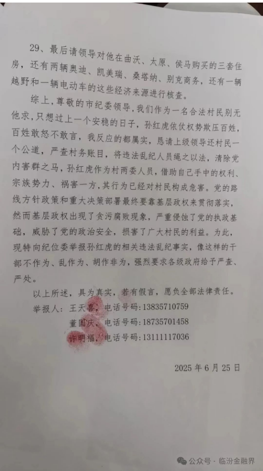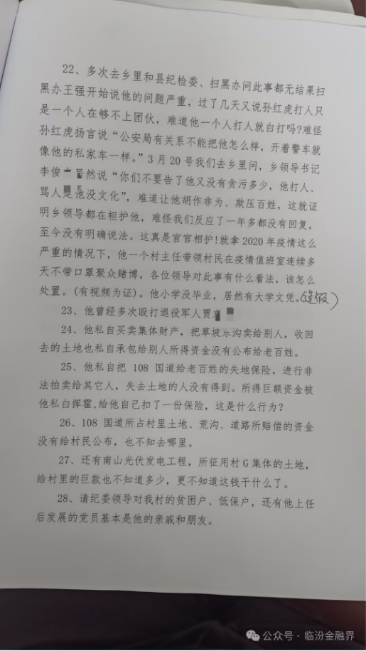 綜上,尊敬的上級領(lǐng)導(dǎo),我們作為一名合法村民別無他求,只想過上一個安穩(wěn)的日子,孫紅虎依仗權(quán)勢欺壓百姓,百姓敢怒不敢言,我反應(yīng)的都屬實,懇請上級領(lǐng)導(dǎo)還村民一個公道,嚴查村務(wù)賬目,將違法亂紀人員繩之以法,清除黨內(nèi)害群之馬。