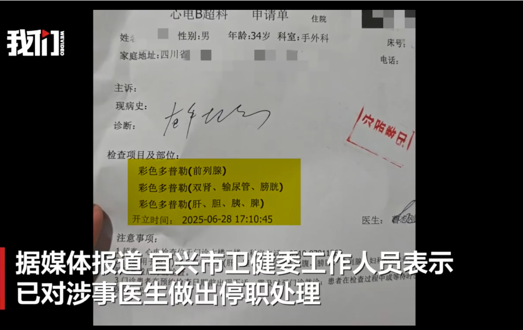 朱先生表示,6月28日他堂哥手部受傷,在江蘇宜興市第六人民醫(yī)院處理手部傷口,隨后他發(fā)現(xiàn)2張醫(yī)生開(kāi)的檢查單,一張是手部CT,一張是彩超檢查單。彩超檢查單包含前列腺等多項(xiàng)看起來(lái)與手傷“不相干”的科目。