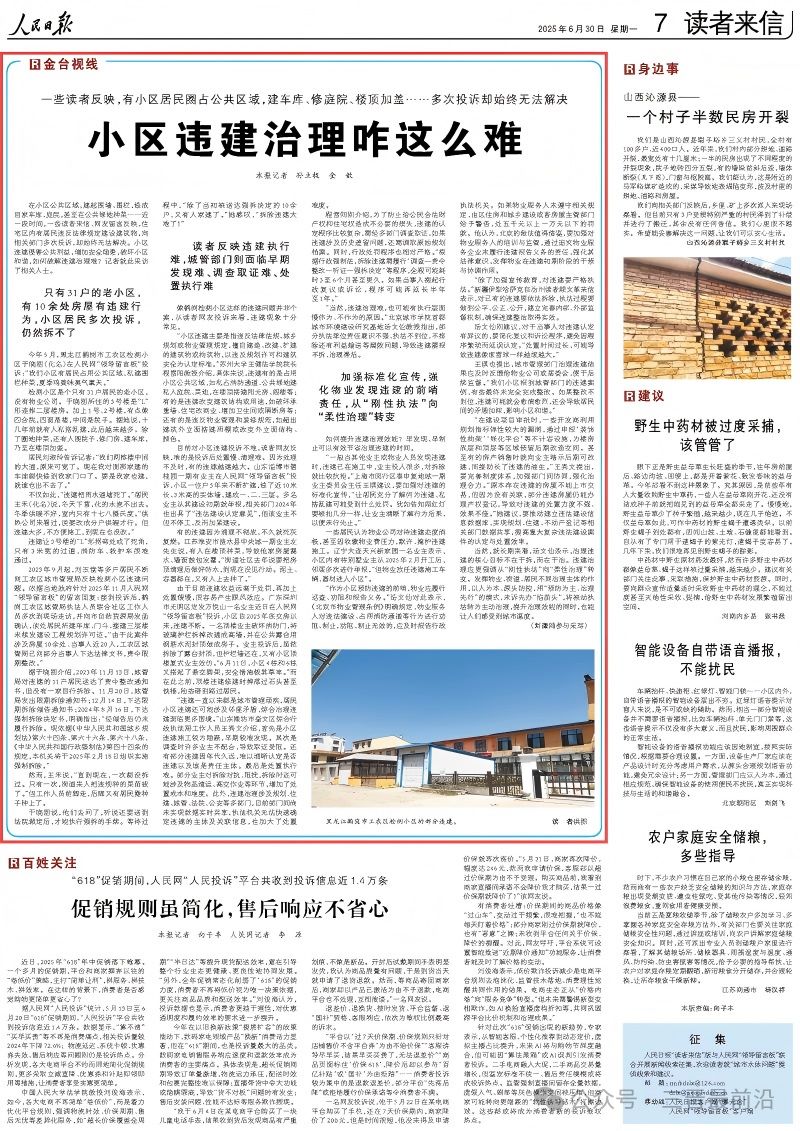 “在建設(shè)項(xiàng)目審批時(shí),一些開發(fā)商利用規(guī)劃指標(biāo)彈性較大的漏洞,通過申報(bào)‘裝飾性構(gòu)架’‘綠化平臺(tái)’等不計(jì)容設(shè)施,為樓房底層和頂層等區(qū)域預(yù)留后期改造空間。甚至有的房產(chǎn)銷售時(shí)就向業(yè)主暗示后期可改建,間接助長了違建的滋生?!蓖跣阄奶岢?,要完善制度體系,加強(qiáng)部門間協(xié)同,強(qiáng)化治理合力。“原本存在違建的房屋不能上市交易,但因?yàn)闆]有關(guān)聯(lián),部分違建房屋仍能辦理產(chǎn)權(quán)登記,導(dǎo)致對(duì)違建的處置力度不強(qiáng)、效果不佳?!彼ㄗh,要推動(dòng)建立違法建設(shè)信息數(shù)據(jù)庫,實(shí)現(xiàn)規(guī)劃、住建、不動(dòng)產(chǎn)登記等相關(guān)部門數(shù)據(jù)共享,提高重大復(fù)雜違法建設(shè)案件的認(rèn)定與處置效率。