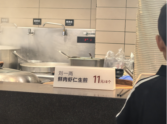 而第二張圖片中攤位實際銷售產(chǎn)品的白色不顯眼的小標(biāo)示牌中卻是“鮮肉蝦仁生煎11元/4個”。