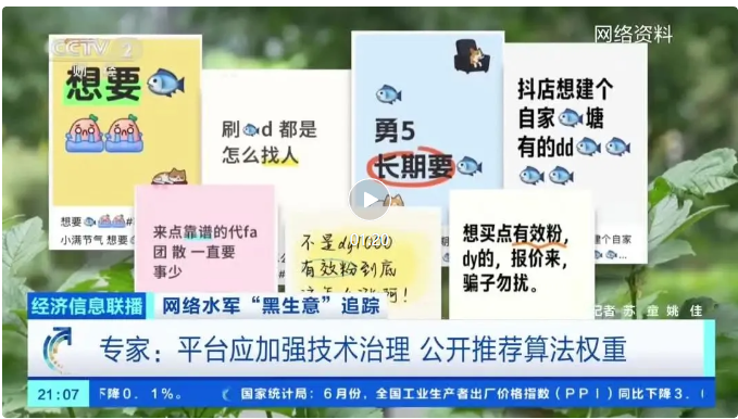 對此,專家表示,網(wǎng)絡(luò)水軍的本質(zhì)是通過刷評、刷單等方式,偽造虛假互動數(shù)據(jù),影響平臺算法推薦邏輯。