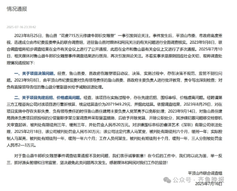 7月16日晚,平頂山市聯(lián)合調(diào)查組再次就“魯山縣花費(fèi)715萬(wàn)元修建牛郎織女雕塑”一事發(fā)布情況通報(bào)。通報(bào)稱(chēng),2023年9月8日,由平頂山市紀(jì)委監(jiān)委對(duì)負(fù)有領(lǐng)導(dǎo)責(zé)任的魯山縣委、縣政府主要負(fù)責(zé)人進(jìn)行批評(píng)教育,責(zé)令寫(xiě)出深刻檢查;對(duì)負(fù)有直接領(lǐng)導(dǎo)責(zé)任的魯山縣分管副縣長(zhǎng)給予誡勉談話(huà)處理。2025年2月18日,與事件相關(guān)多人已獲刑。