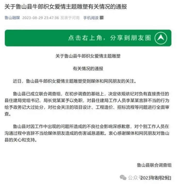 2023年8月31日,平頂山市發(fā)布官微消息,平頂山市聯(lián)合調(diào)查組通報(bào),就廣大群眾關(guān)注的魯山縣牛郎織女愛(ài)情主題雕塑一事,平頂山市委、市政府已成立由住建、財(cái)政、審計(jì)、紀(jì)委監(jiān)委等部門(mén)組成的聯(lián)合調(diào)查組開(kāi)展深入、全面的調(diào)查審查工作,調(diào)查結(jié)果將及時(shí)向社會(huì)公布。