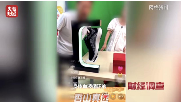 記者假稱合作,進入了直播間。主播不斷宣傳一款磁懸浮鞋和鞋墊的獨家專利及神奇功效。