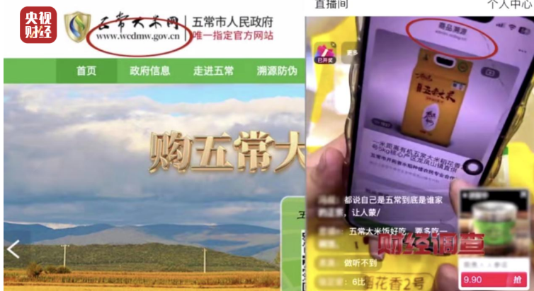 不僅如此,直播間還售賣“一米距離”牌五常大米,主播現(xiàn)場展示掃描產品的溯源網站,實際打開的卻并非五常市人民政府指定的五常大米網。