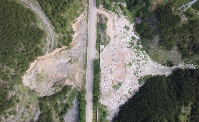 山溝兩側(cè)堆放建筑垃圾:廢磚廢石、廢棄電纜、廢棄鋼筋、廢棄塑料板、廢棄遮蓋用綠網(wǎng)……有的散亂堆放,有的則用編織袋裝著;中間則堆放著10余米高,未被分類處理的生活垃圾。垃圾場緊鄰二廣高速,從航拍畫面看,垃圾場像是玉米地里一條裂開的“傷疤”。