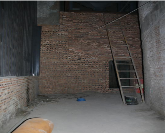 本次事故發(fā)生地點為保德縣彬凱水泥有限公司,該企業(yè)正處于檢維修狀態(tài)。事發(fā)現(xiàn)場位于石膏料棚和圓庫間的一條不規(guī)則通道內(nèi)(如圖1、圖2所示),該通道最窄處約210cm,深約910cm,開口處較寬。料棚位于西側,圓庫位于東側,北面是高約470cm磚墻,上方留有約150cm的空間。頂部用金屬材質(zhì)采光板封閉,南面呈開放式狀態(tài),北墻上架設一部鐵質(zhì)梯子,該梯子長600cm,寬58cm,梯子底部緊挨圓庫邊緣,距北墻243cm,梯子頂部與北側磚墻頂部平行,梯子與地面夾角約63°。梯子西側有一頂破損的藍色安全帽,安全帽距西墻117cm,距北墻133cm,安全帽北側有一灘血跡,血跡距西墻129cm,距北墻30cm。