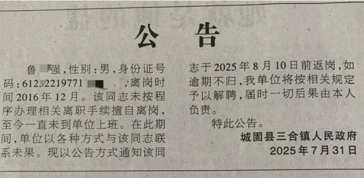 公開信息顯示,8月1日,陜西省城固縣三合鎮(zhèn)人民政府登報(bào)稱,魯某強(qiáng)于2016年12月離崗。該同志未按程序辦理相關(guān)離職手續(xù)而擅自離崗,至今一直未到單位上班。在此期間,單位以各種方式與該同志聯(lián)系未果?,F(xiàn)以公告方式通知該同志于2025年8月10日前返崗,如逾期不歸,該單位將按相關(guān)規(guī)定予以解聘,一切后果由本人負(fù)責(zé)。