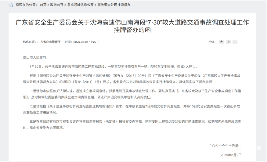 記者從廣東省應急管理廳獲悉,7月30日,沈海高速佛山西二環(huán)西樵路段,一輛重型半掛牽引車與一輛小型轎車發(fā)生碰撞,造成4人死亡。8月2日,廣東省安全生產委員會發(fā)布《廣東省安全生產委員會關于沈海高速佛山南海段“7·30”較大道路交通事故調查處理工作掛牌督辦的函》,決定對該起事故查處掛牌督辦。