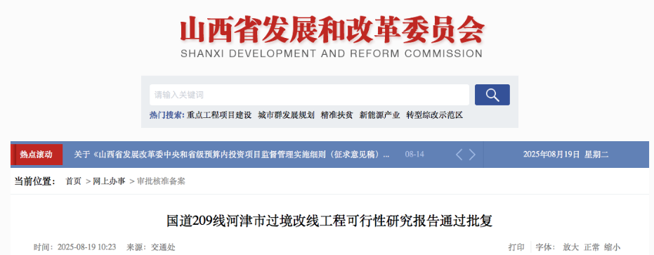 8月19日,山西省發(fā)改委以晉發(fā)改審批發(fā)〔2025〕265號批復了國道209線河津市過境改線工程可行性研究報告。該項目位于運城河津市境內(nèi),整體呈南北走向,路線起點位于河津市樊村鎮(zhèn)寺莊村,終點位于城區(qū)街道吳家關(guān)村,與既有國道209相接,全長約22.7公里。