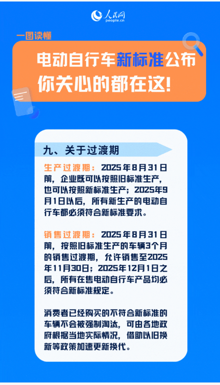 2025年9月1日以后,所有新生產(chǎn)的電動自行車都必須符合新國標(biāo)要求。在銷售方面,新國標(biāo)則額外給予2025年8月31日及之前按照舊標(biāo)準(zhǔn)生產(chǎn)的車輛3個月的銷售過渡期,允許銷售至2025年11月30日;2025年12月1日之后,所有銷售的電動自行車產(chǎn)品均必須符合新標(biāo)準(zhǔn)規(guī)定。