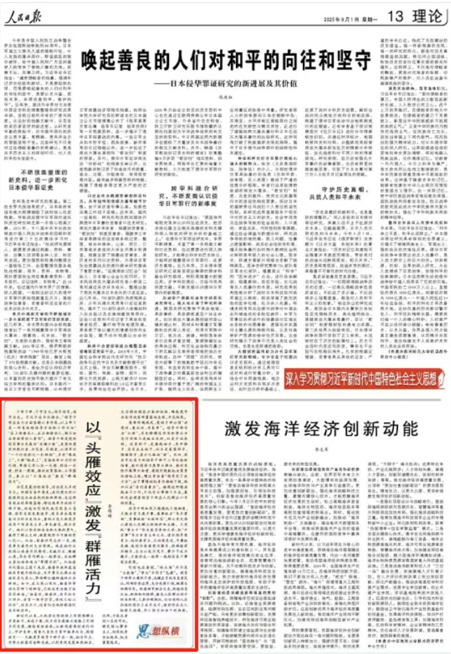 9月1日,《人民日報》理論版刊發(fā)文章《以“頭雁效應(yīng)”激發(fā)“群雁活力”》。