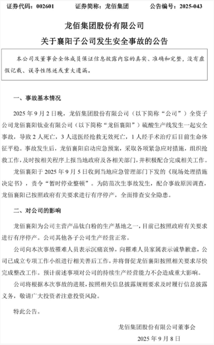 龍佰襄陽于2025年9月5日收到當(dāng)?shù)貞?yīng)急管理部門下發(fā)的《現(xiàn)場處理措施決定書》,責(zé)令“暫時(shí)停業(yè)整頓”。為防范次生事故發(fā)生,配合事故原因調(diào)查龍佰襄陽已按照政府有關(guān)要求進(jìn)行有序停產(chǎn),全面排查安全隱患。