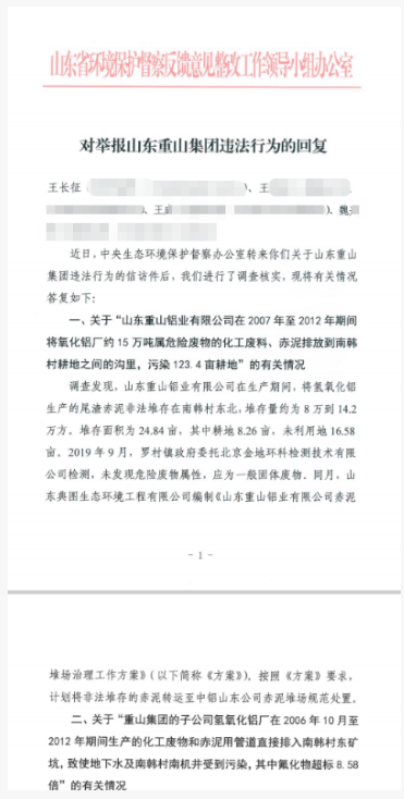 同年12月12日,山東省環(huán)境保護(hù)督察反饋意見整改工作領(lǐng)導(dǎo)小組辦公室反饋稱,調(diào)查發(fā)現(xiàn),山東重山鋁業(yè)有限公司生產(chǎn)期間,將氫氧化鋁生產(chǎn)的尾渣赤泥非法堆存約8萬到14.2萬方。堆存面積24.84畝,為一般固體廢物……南韓村南水井檢測,氟化物超標(biāo)4.6倍……但尚未發(fā)現(xiàn)山東重山集團(tuán)排放含氟污染物的確定證據(jù)和機(jī)井水氟化物污染的準(zhǔn)確來源。