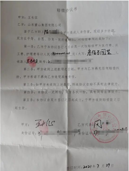 2021年7月29日,王長征與山東重山集團(tuán)有限公司簽訂《賠償協(xié)議》稱,山東重山集團(tuán)員工陳某給王長征造成人身傷害,經(jīng)多方協(xié)調(diào),山東重山集團(tuán)于協(xié)議簽訂之日,自愿一次性賠償王長征醫(yī)療費(fèi)、誤工費(fèi)、護(hù)理費(fèi)等計(jì)人民幣300萬元。王長征收到上述款項(xiàng)起,雙方再無任何賠償糾紛,王長征不再向山東重山集團(tuán)追究其他責(zé)任。