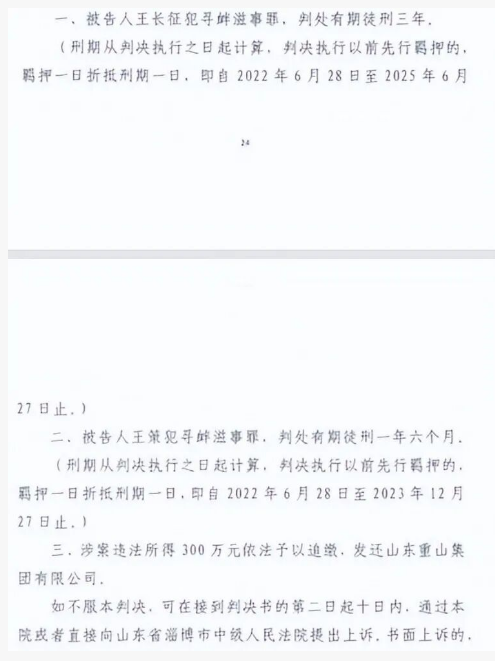 2023年12月21日,淄川區(qū)法院一審判決。判決書顯示,法院認(rèn)為,從表面看,此案系山東重山集團(tuán)就王長征被打傷一事達(dá)成賠償協(xié)議,賠償300萬元人身損害賠償,實(shí)質(zhì)是被告人王長征長期、頻繁投訴給山東重山集團(tuán)生產(chǎn)經(jīng)營造成不利影響下,以被該公司保安打傷為借口,借協(xié)商之機(jī),利用簽署賠償協(xié)議的形式達(dá)到向山東重山集團(tuán)斂取巨額財(cái)物的非法目的……王長征犯尋釁滋事罪,判處有期徒刑三年;王策犯尋釁滋事罪,判處有期徒刑一年六個(gè)月。涉案違法所得300萬元依法予以追繳,發(fā)還山東重山集團(tuán)。