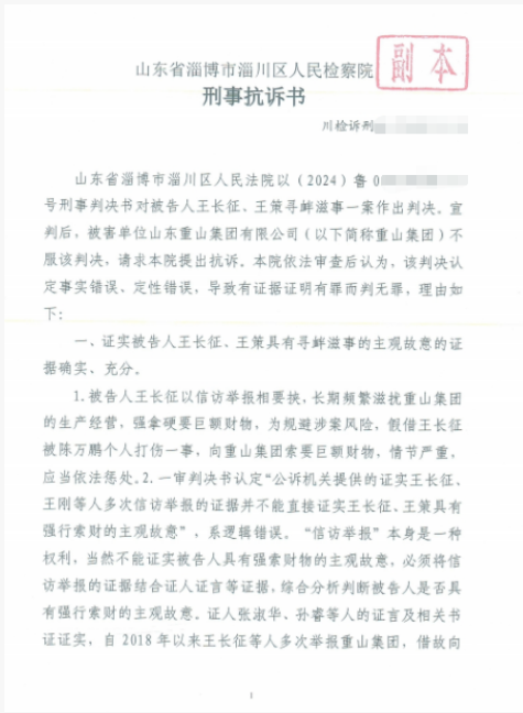 兩人利用投訴舉報(bào)強(qiáng)拿硬要財(cái)物的證據(jù)確實(shí)、充分。認(rèn)為王長征等人的信訪舉報(bào)、堵路等行為對重山集團(tuán)形成了強(qiáng)制,因此多次停產(chǎn)停工等。綜上所述,淄川區(qū)法院《刑事判決書》認(rèn)定的事實(shí)確有錯(cuò)誤、定性錯(cuò)誤,有充分證據(jù)證明有罪判無罪。特提出抗訴,請依法改判。