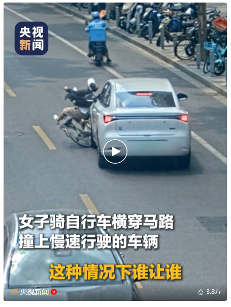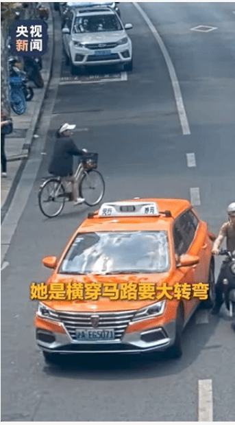視頻顯示,一名女子騎自行車邊轉彎邊橫穿馬路,與一輛慢速行駛的車輛發(fā)生碰撞,女子倒地受傷。