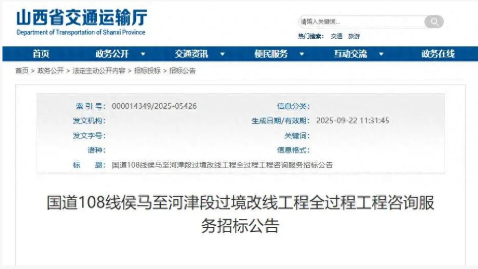 近日,從山西省交通運輸廳傳來振奮人心的消息,備受矚目的國道108線侯馬至河津段過境改線工程有了實質(zhì)性推進,其全過程工程咨詢服務(wù)招標公告正式公示。這一消息猶如一顆投入平靜湖面的石子,在臨汾市侯馬市、運城市新絳縣、稷山縣以及河津市等地激起層層漣漪,沿線居民對工程的期待值直線上升。