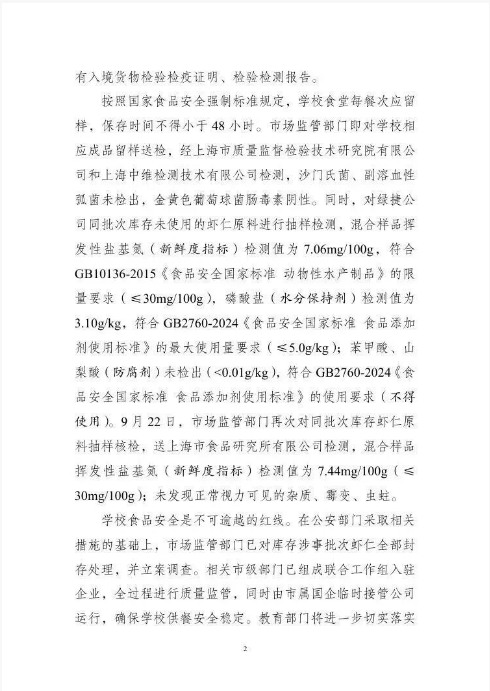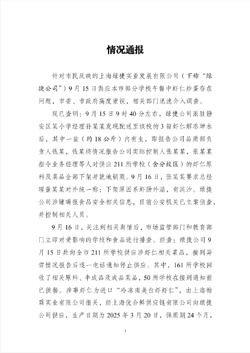 今日(23日),針對市民反映的上海市部分學(xué)校午餐中蝦仁炒蛋存在問題一事,上海市公安局、上海市市場監(jiān)督管理局、上海市教育委員會發(fā)布情況通報。涉事企業(yè)綠捷公司涉嫌瞞報食品安全相關(guān)信息,目前公安機(jī)關(guān)已立案偵查,并控制相關(guān)人員。