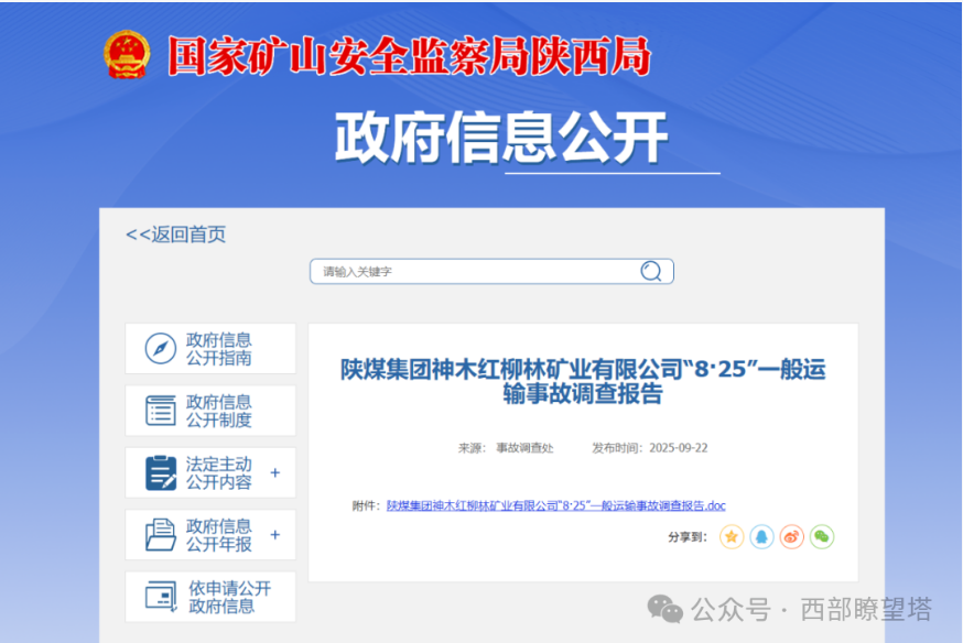 日前,國(guó)家礦山安全監(jiān)察局陜西局在其官網(wǎng)發(fā)布《陜煤集團(tuán)神木紅柳林礦業(yè)有限公司“8·25”一般運(yùn)輸事故調(diào)查報(bào)告》(以下簡(jiǎn)稱《調(diào)查報(bào)告》),《調(diào)查報(bào)告》顯示,2025年8月25日10時(shí)18分,陜煤集團(tuán)神木紅柳林礦業(yè)有限公司(以下簡(jiǎn)稱“紅柳林礦業(yè)公司”)三號(hào)風(fēng)井建設(shè)項(xiàng)目進(jìn)風(fēng)斜井掘進(jìn)工作面發(fā)生一起一般運(yùn)輸事故,造成1人遇難,直接經(jīng)濟(jì)損失131.7萬(wàn)元。