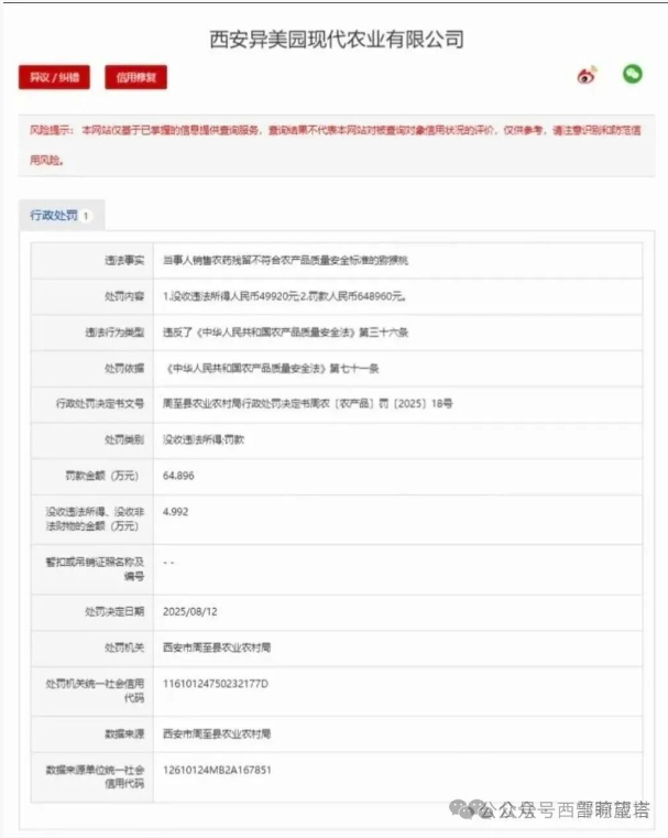 據(jù)信用中國(陜西)公開的行政處罰決定書內(nèi)容顯示,西安異美園現(xiàn)代農(nóng)業(yè)有限公司因銷售農(nóng)藥殘留不符合農(nóng)產(chǎn)品質(zhì)量安全標(biāo)準(zhǔn)的獼猴桃,西安市周至縣農(nóng)業(yè)農(nóng)村局依據(jù)《中華人民共和國農(nóng)產(chǎn)品質(zhì)量安全法》第七十一條,對該公司進(jìn)行處罰:1.沒收違法所得人民幣49920元;2.罰款人民幣648960元。