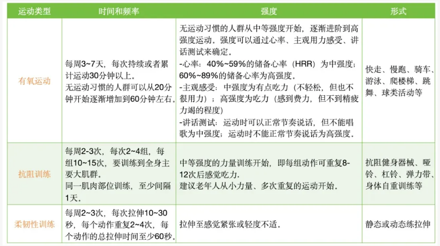 建議每周有氧運動、抗阻訓練、柔韌性訓練搭配進行。