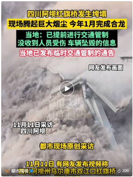 11月11日,多位網(wǎng)友發(fā)布視頻反映四川阿壩州馬爾康市紅旗特大橋發(fā)生垮塌,視頻畫(huà)面顯示,山體傾瀉大量山石,靠近山體一側(cè)的橋墩和橋面發(fā)生斷裂垮塌。