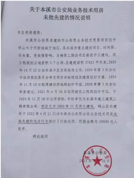 2021 年初。本溪市公安局在明山區(qū)威寧大街北側(cè)動工建辦公大樓,當?shù)厝硕加X得是件便民好事??赏辽灵L的趙先生多了個心眼,趙先生多方打聽后發(fā)現(xiàn),這棟樓開工時并沒有拿到《建設工程規(guī)劃許可證》是典型的 “未批先建”。